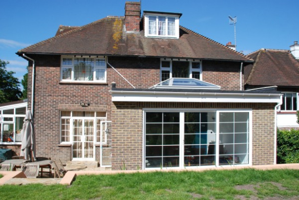 Rear extension to art deco detached house. The brief was to create new windows and door to complement existing art deco style. Addition of a family breakfast room completely transformed original kitchen.