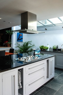 Side extension to enlarge kitchen to this mid terraced house. The site is sloping and surrounded by big trees so we added a glass roof to allow light to flood into back of dining room.